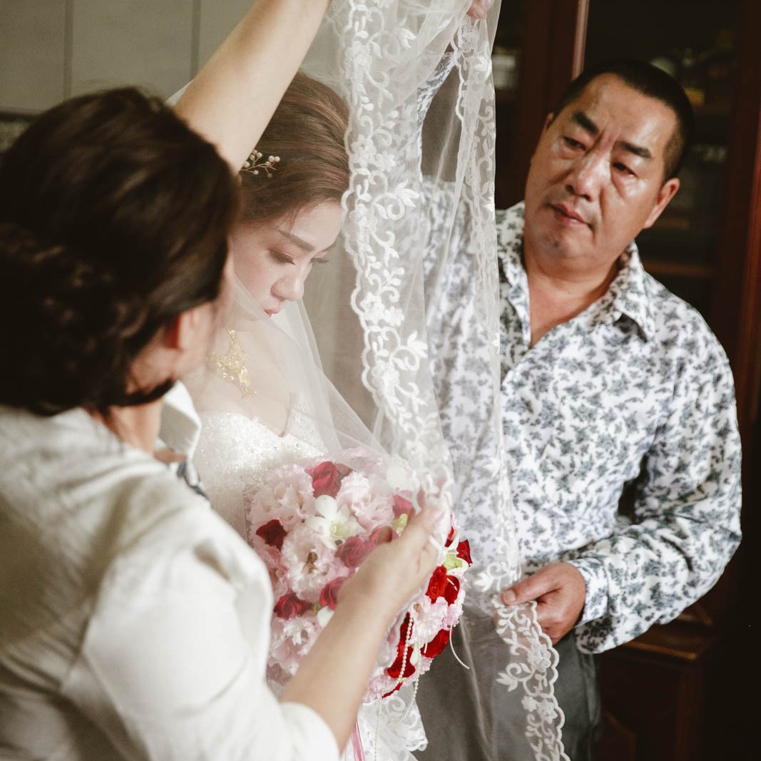 媽媽帶著不捨、祝福的心情,為女兒整理著婚紗
