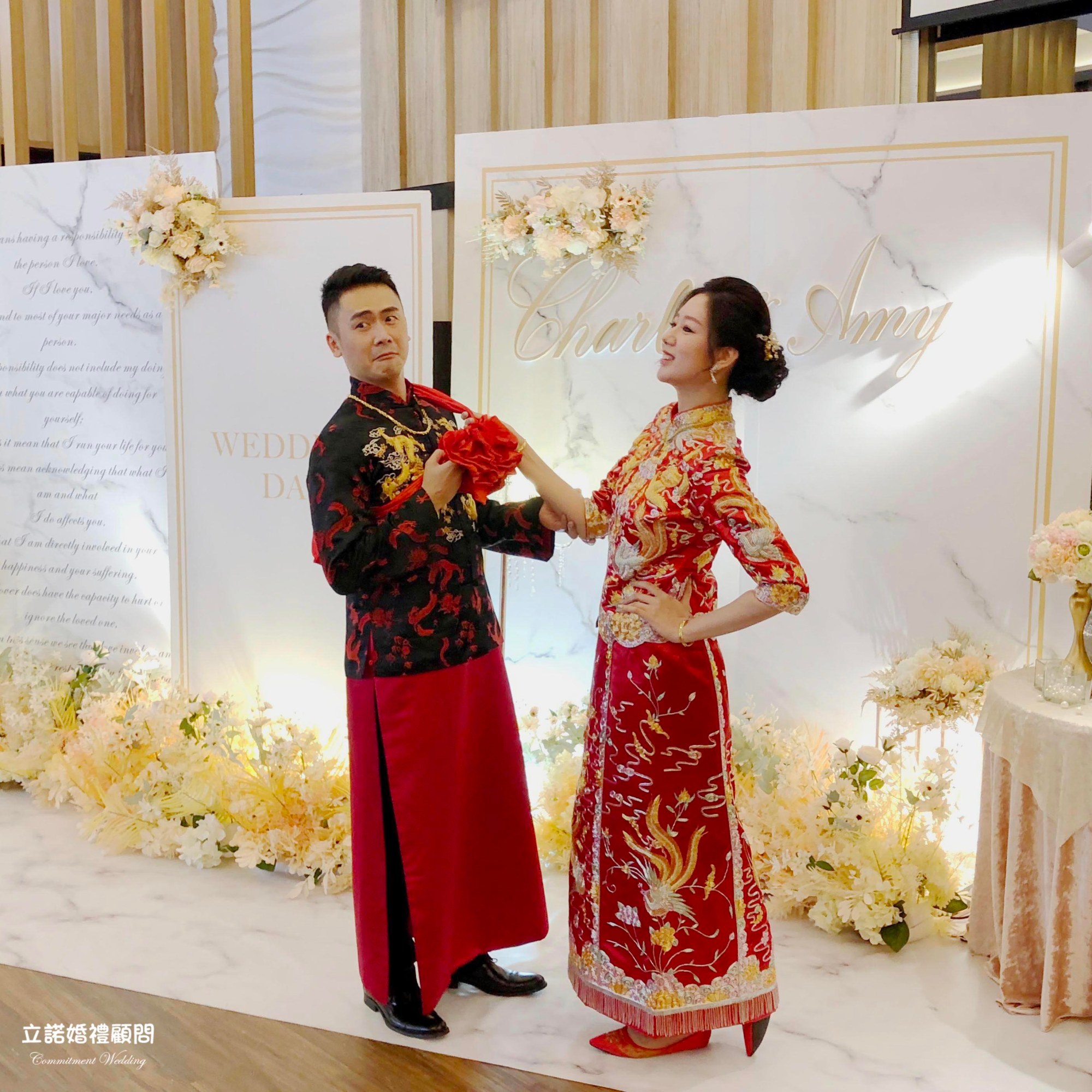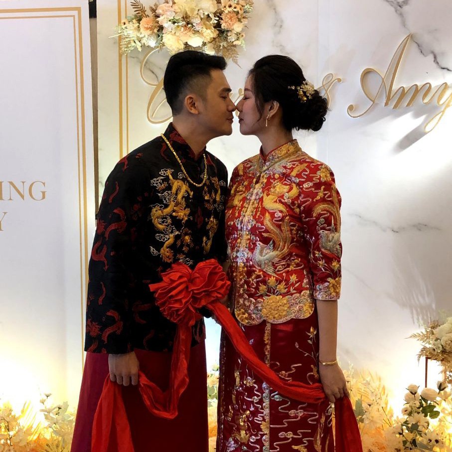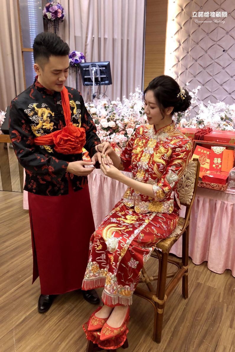 在這充滿喜氣的日子,我們新人穿著的是我們中式婚禮代表之一 龍鳳掛
