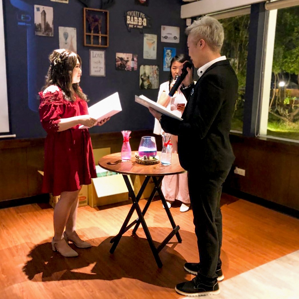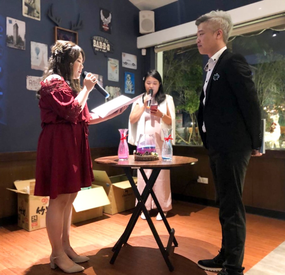 害羞的倆人,交換完誓詞,在交換戒指這一刻